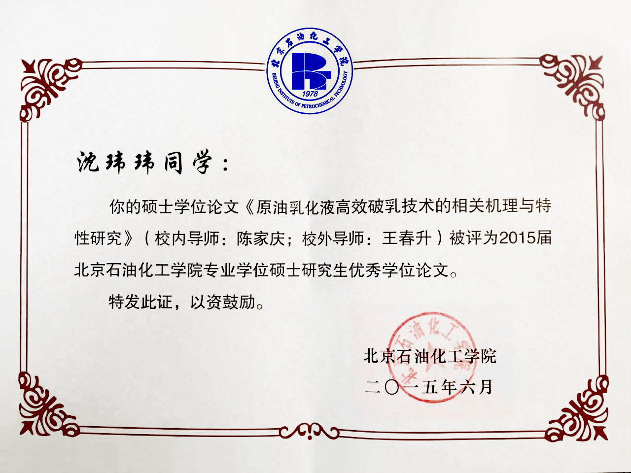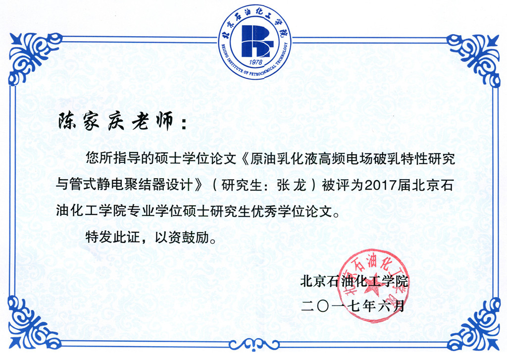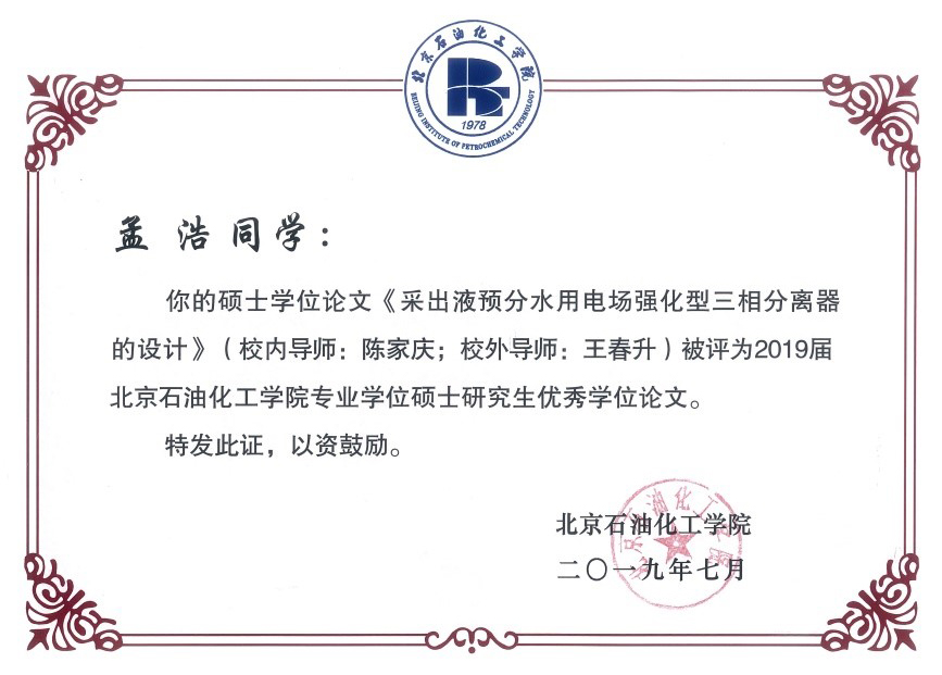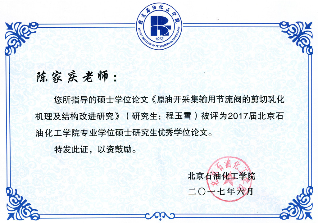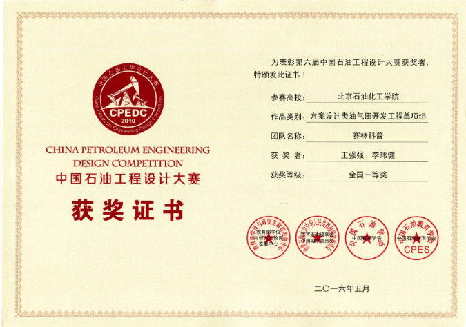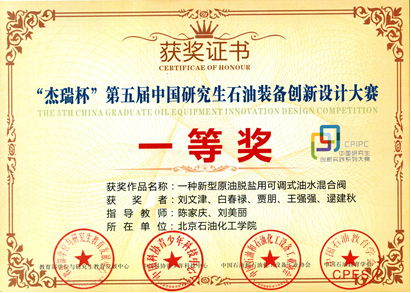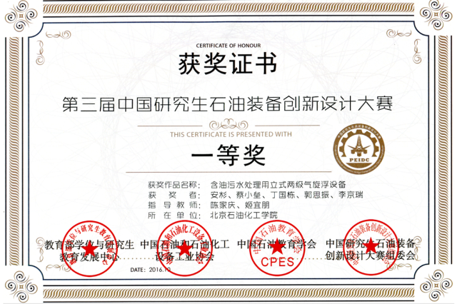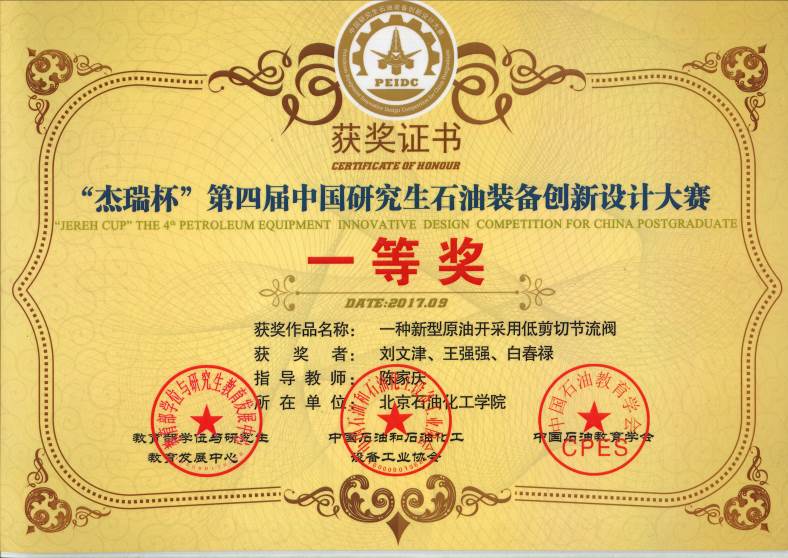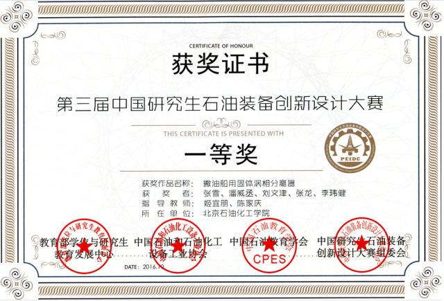 [4] 课题组指导的研究生多次在“中国研究生创新实践系列大赛”中获奖。如:在第二届(2015年10月)中国研究生石油装备创新设计大赛中,参赛团队(程玉雪、孔祥功、潘泽昊、方相九、汤水清)以作品“一种新型动态水力旋流器 —— 轴向涡流分离器”荣获一等奖;在第三届(2016年10月)中国研究生石油装备创新设计大赛中,参赛团队(安杉、蔡小垒、丁国栋、郭思振、李京瑞)以作品“含油污水处理用立式两级气旋浮设备”荣获一等奖,参赛团队(张雪、潘威丞、刘文津、张龙、李玮健)以作品“撇油船用固体涡相分离器”荣获一等奖;在第四届(2017年9月)中国研究生石油装备创新设计大赛中,参赛团队(刘文津、王强强、白春禄)以作品“一种新型的原油开采用低剪切节流阀”荣获一等奖;在第五届(2018年8月)中国研究生石油装备创新设计大赛中,参赛团队(刘文津、白春禄、贾朋、王强强、逯建秋)以作品“一种新型原油脱盐用可调式油水混合阀”荣获一等奖。此外,北京石油化工学院机械工程领域2015级专业学位硕士研究生(王强强、李玮健)组建的“赛林科普”参赛团队,2016年5月荣获第六届中国石油工程设计大赛方案设计类油气田开发工程单项组一等奖。