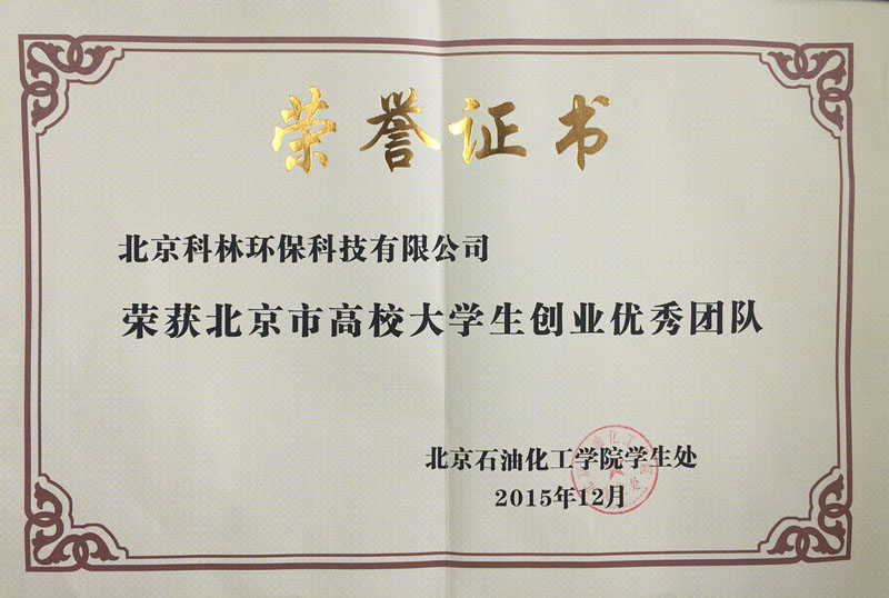 [5] 课题组指导的研究生在创新创业活动方面表现良好。本校机械工程领域专业学位硕士研究生(孔祥功、潘泽昊、石熠、王强强等)虚拟组建的“北京科林环保科技有限公司”,2015年12月荣获北京市高校大学生创业优秀团队。